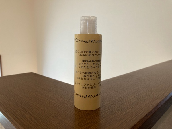 私は昨年の12月定例会の一般質問で、援助会員の皆さんが少しでも安心して活動できるよう、消毒液等を配布して頂けるよう要望した結果、配布が始まり、最近も配られました(写真)。