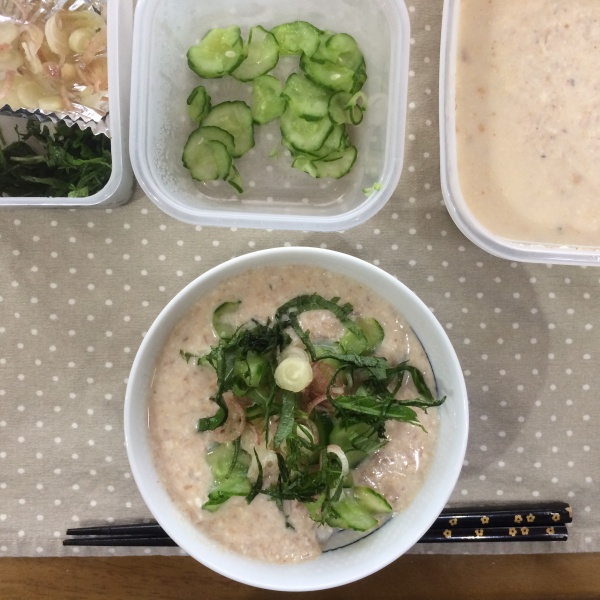 奥さんが作ってくれた今年初の冷や汁は、白みそ仕立てでした。