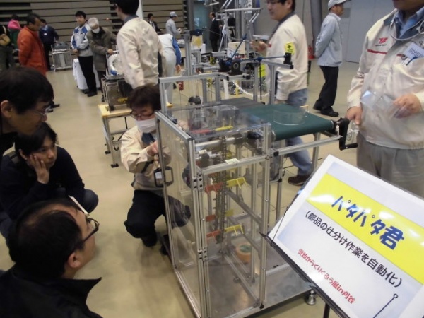 私の勤務先 トヨタ紡織の「パタパタ君」は、おもりが下がる力を使って部品の仕分けをします。正面の扉を開けるとストッパーが働き、内部機構が停止するなど、安全面にも配慮されている事に感心しました。