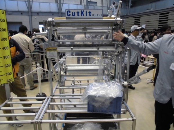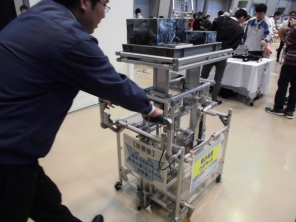 豊田自動織機さんの「さぶちゃん」は、部品を供給する台車で、おもりが下がる力と押す力でテーブルを上昇させます。その仕組みは興味深かったです。