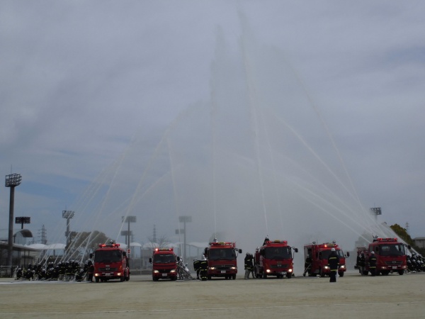一斉放水は壮観です。