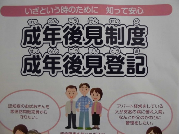 成年後見制度は、認知症、知的障がい、精神障がいなどにより、判断能力が不十分な方々の預貯金管理や、介護サービスや施設入所などの契約を、成年後見人等(成年後見人、保佐人、補助人)と呼ばれる人が代理で行う制度です。障がい等のある方々を保護・支援する制度なのですが、講師の弁護士さんの説明では、この制度には様々な課題があり、制度内容とリスクをよく理解する必要があるとの事でした。本日は短時間の講義でしたが、今後、制度のあり方や問題点を更に勉強していきたいと思います。