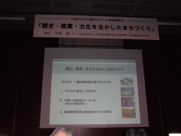 場所は社会教育センター、講師は日本観光振興協会の丁野常務理事です。