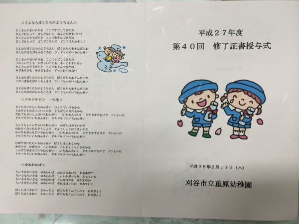 今年も重原幼稚園の修了証書授与式(卒園式)にお招き頂きました。25名の園児たちが一人づつ修了証を授与され、幼稚園での思い出を元気な声で発表してくれました。そして、保護者の方に修了証と一緒に、ポケットから出したお手紙を渡しました。サプライズなのかどうかわかりませんが、皆さん感動しておられました。この子たちがいきいきと学び、成長できるまちづくりに引き続き取り組んでいきたいと思います。皆様、本日は誠におめでとうございます。