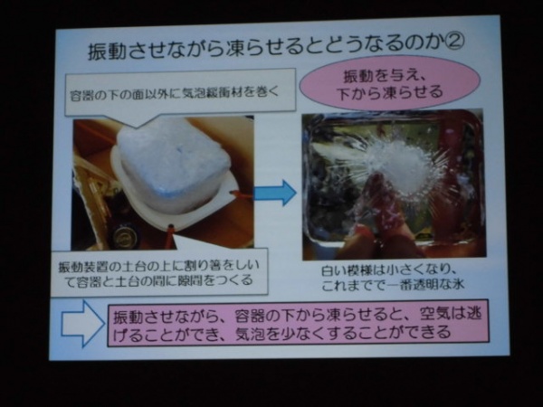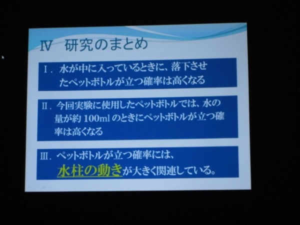 水を入れ落下させたペットボトルが立つ確率を高める朝日中の研究。