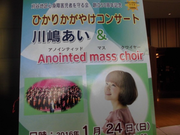 刈谷市心身障害児者を守る会の創立50周年記念コンサートが総合文化センターで開催されました。50年の長きに渡り、障がい福祉に取り組んでこられた関係各位に心より敬意を表します。前半はアノインテッド・マス・クワイヤーというゴスペルグループ、後半がミュージシャンの川嶋あいさんのライブでした。川嶋さんは歌手になりたい一心で16才で上京し、大切な家族を失う苦難を乗り越え、プロデビューした苦労人ですが、大変元気な方で、フルマラソンも完走するそうです。ギターとピアノと歌のみというシンプルな構成でしたが、パワフルな歌声を聴かせてくれました。フィナーレは、ひかりの家の皆さんと川嶋さんの合唱でした。障がいの有無に関わらず幸せに暮らせるまちづくりに引き続き取り組んでまいります。