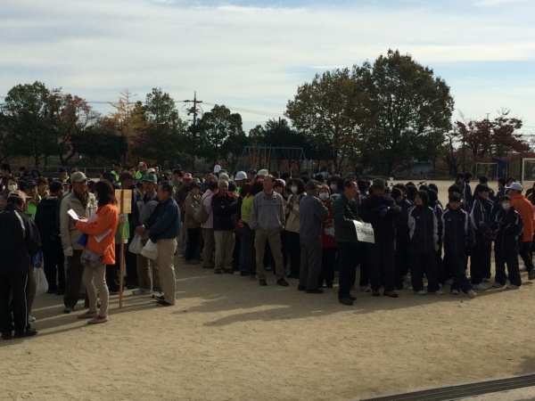 校庭に出て、名簿づくりなどの立ち上げ訓練が行われました。