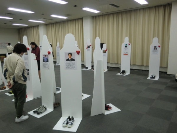 このイベントは、悪質なドライバーが引き起こした交通事故や非情な殺人などにより、理不尽に生命を奪われてしまった人々のアート展で、犠牲となった方々の等身大の人型(メッセンジャーと呼ばれます)が展示されています。そして、胸元には本人の写真、亡くなった経緯、残された家族の言葉などが貼られ、足元にはその人が生きた証として、生前履いていた靴が置かれています。展示を見た誰もが言葉を失い、人型に見入っていました。命を奪われた被害者の無念さや、家族の悲痛な叫びを伝える事は、もっとも効果的な啓発活動ではないでしょうか。先日、刈谷市で交通安全オープニングキャンペーンが行われましたが、加えてこうした展示活動をどんどん開催してほしいと思います。私も安全運転を強く心に誓いました。