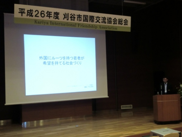 刈谷市国際交流協会は、諸外国や刈谷に滞在する外国人の方々と市民レベルの交流を行う団体であり、毎年この時期に総会と講演会が行われます。今年度は、姉妹都市であるミササガ市のマッキャリオン市長が早々に来刈されるなど活発に活動しておられ、今後も様々なイベントを行う予定です。総会後はマルセロ渡辺氏(13才で来日し、行政書士として活躍する日系ブラジル3世の方)の講演を聴講しました。講義では、ブラジルから来日しても学校をドロップアウトしてしまう子どもが多い現実や、この子たちがもっと多くの日本人と触れ合い、その可能性を伸ばす事の大切さを訴えておられました。ブラジルではサッカーW杯とリオ五輪の開催を控えていますので、この事をきっかけに刈谷でも草の根レベルの交流が進むと良いですね。関係各位におかれましてはご苦労様でした。