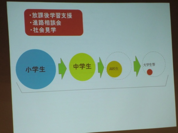 来日後、次第に減っていくブラジル人の子ども達のイメージ図です。日本での生活になじめない子が多い現実が見てとれます。