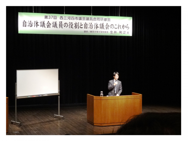 岡崎、豊田、安城、知立の4市が合同で行っている議員研修会に、刈谷など西三河5市の議員が試行的に参加し、岡崎市内で開催されました。テーマは「自治体議員の役割と自治体議会のこれから」で、講師は東大法学部の金井教授です。講義の内容は、二元代表制(地域住民が自治体の首長(市長等)と議会の議員を別々の選挙で選ぶ仕組み)の機能、首長と議員の権力バランス、新たな議会のあり方などです。議員になりたての頃にはピンと来なかった様々な課題が、議員3年目に改めて聞くと、かなり実感できるようになっていました。議員としての意識をどう持つべきか、首長・議会・住民のあるべき関係等について考え直す良い機会でした。
