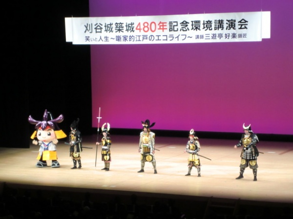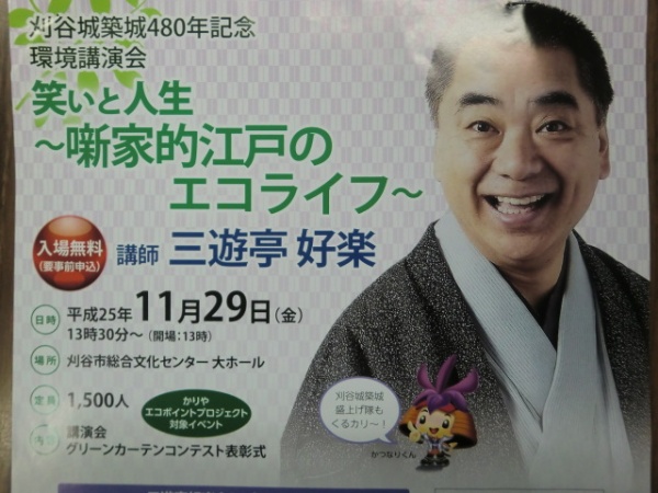 総合文化センターで環境講演会が行われ、笑点でおなじみの三遊亭好楽さんが来刈しました。TVの人気者の講演ですので、平日の午後にも関わらず多くの方が来場されました。グリーンカーテンコンテストの表彰式、刈谷城築城480年盛上げ隊の演舞に続き好楽さんが登場しました。途中5分程の休憩を挟み約1時間半の講演でしたが、観客を惹きつけ、休みなく話し続けるプロの噺家の力に感心しました。ある程度筋書きがあるのか、大半がアドリブなのかは解りませんが、ある境地に達しながらも自分を磨き続けなければできないと思います。好楽さんは御年67才だそうです。私は現在48歳ですので、20年後も心身ともに健康でいられるよう努めていきたいと思います。