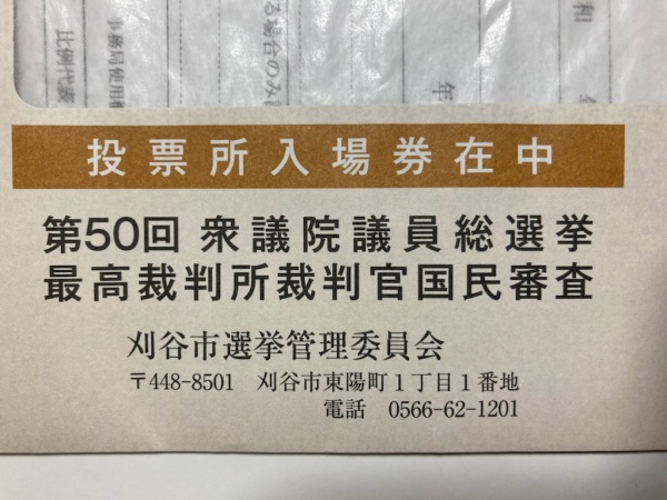 明日27日は衆議院選挙の投開票日です。刈谷市の有権者の皆様にはこの封筒が届いていると思います。