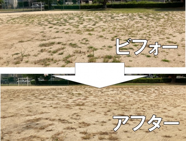 中山公園の広場は、毎夏雑草がくり返し繁茂し、運動機能が阻害されますので、今回初めて実施して頂きました。広場全体の除草にはまだ数日かかりますが、今後も動向を注視し、効果の確認をしてまいります。