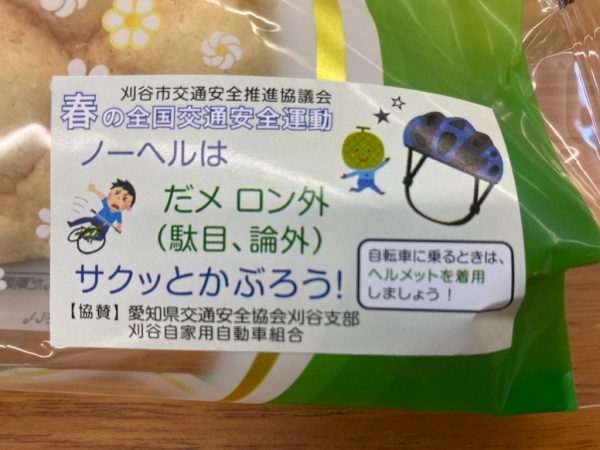 毎年、交通安全に関する取り組みを商品名とコラボさせ、駅利用者に配布するのですが、今年の商品はメロンパンで、命名は、