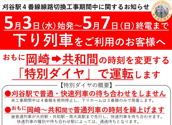 本日から7日まで、JR刈谷駅の下り線ホームの拡幅工事に伴い、下り線が特別ダイヤになります。