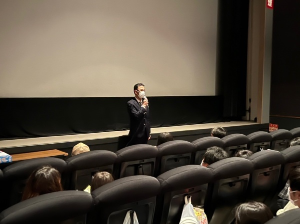 あいさつをする私。会場は安城コロナシネマワールドです。