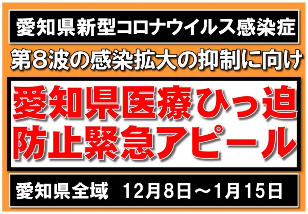 そこで愛知県は、医療体制機能の維持・確保のため、県独自の「愛知県医療 ひっ迫防止緊急アピール」を発出する事としました。