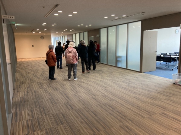 産業振興センターへの避難訓練の様子。