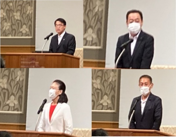 来賓各位のあいさつの様子。左上:大村愛知県知事、右上:連合愛知の可知会長、右下:伊藤参議院議員、右下:斎藤参議院議員