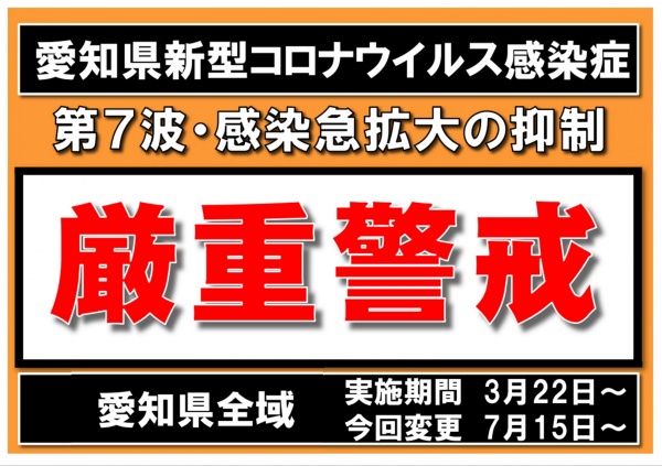 3/22より、愛知県が県全域に「厳重警戒」における感染防止対策を呼び掛けてきましたが、6/21よりコロナが第7波に突入したことを受け、感染急拡大抑制に向けたメッセージが発出されました。