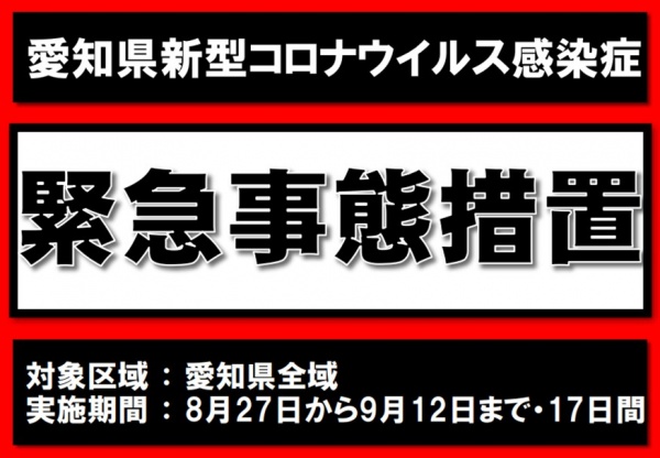 コロナ第5波のかつてない規模の感染拡大を受け、愛知県下に発出されていたまん延防止等重点措置は、緊急事態宣言に切り替えられ、9/12まで適用される事になりました。
