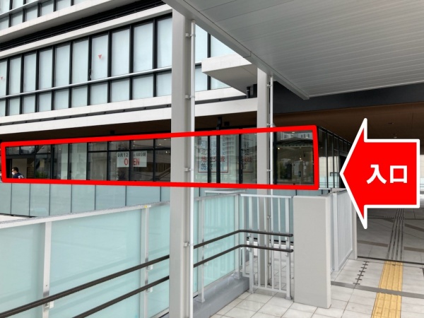 JRの改札を出てデッキ上を右(北口方面)に進み、ビルに入ったところにあります。矢印が入口で、赤枠が交流施設です。