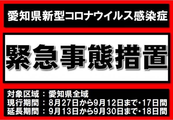 すでにご存じの通り、本日から9/30まで、愛知県に発出されていた緊急事態宣言が延長されます。
