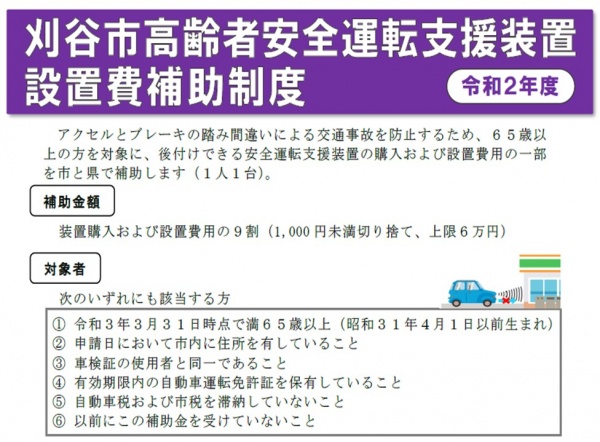 この制度は、市内在住の高齢ドライバーの自家用車に、いわゆる『後付け』の緊急ブレーキの設置を促し、事故低減をはかる取り組みで、昨年12月から刈谷市をはじめ近隣市でも実施されていましたが、県の補助金も含め、今年度も継続される事になりました。