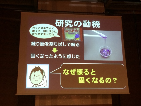 刈谷南中学の発表。煉り飴を練るとなぜ固くなるのかという、興味深い研究内容でした。