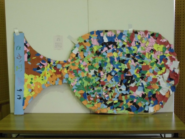 子ども達が作った貼り絵の作品です。本来は木なのですが、作品を寝かせて「魚」にしたとの事です。アイデアが良いですね。