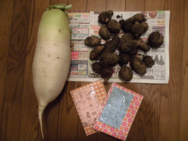 購入した物品の一部です。サトイモと大根は本日美味しく頂きました。